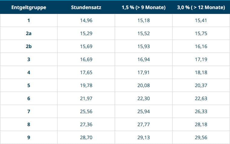 Die Stundenentgelte des DGB-Tarifwerkes können Sie in der Entgelttabelle nachlesen.